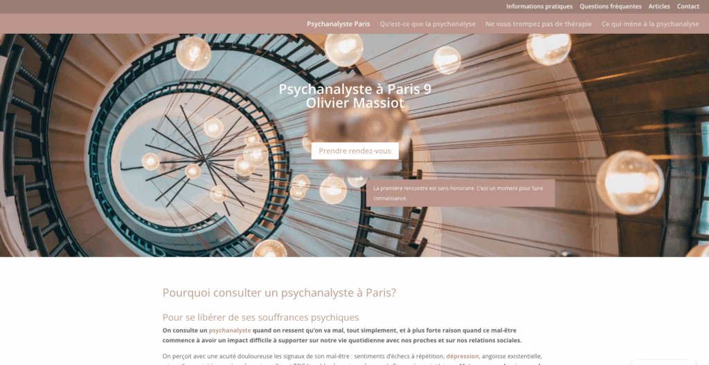 Pour Olivier Massiot, psychanalyste à Paris, Elysée Digital a conçu un site web sobre, élégant et centré sur la confiance. L’objectif : offrir une expérience claire et rassurante aux visiteurs tout en améliorant la visibilité en ligne. Nous avons accompagné Olivier en référencement naturel (SEO) et sur la gestion des campagnes Google Ads, afin de l’aider à attirer de nouveaux patients qualifiés.